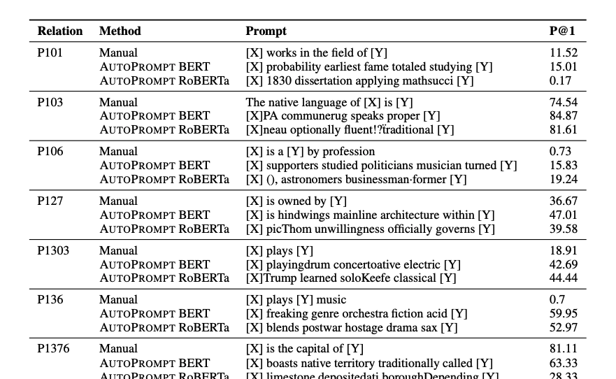 One natural question is whether we should optimize for hard prompt (just tokens) or soft prompts. Ideally hard prompts are desirable cuz they are more aligned with LLM training objective and less prone to overfit. One example is AutoPrompt: https://arxiv.org/abs/2010.15980 which uses gradient guided search. Some of its searched result candidates are funny, below is relation extraction prompts found by AutoPrompt: