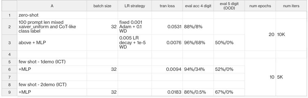 - Adding few shot does not help, likely it’s b/c of inferior of nanoGPT2 as super weak LLM, with bigger LLMs it’s likely to improve much. Nonetheless, prompt-tuning is built for zero-shot only.