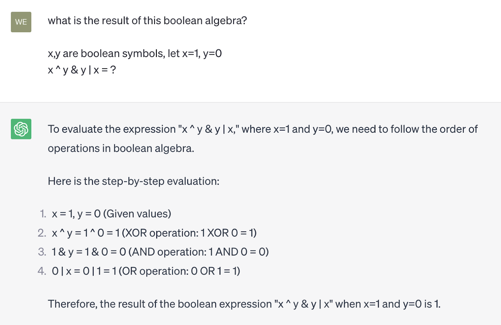 - Symbolic reasoning: there are many of such public benchmarks. Encouraging LLMs to think step by step (CoT) are proven to significantly improve performance on some of the benchmarks (see Chain-of-Thought paper, but the 2 tasks are very simple). I also tried to evaluate a few boolean expressions on GPT4 and it’s 100% accurate: it provides calculation at each step, demonstrating it’s been trained with CoT like process to product answers for such reasoning tasks:
