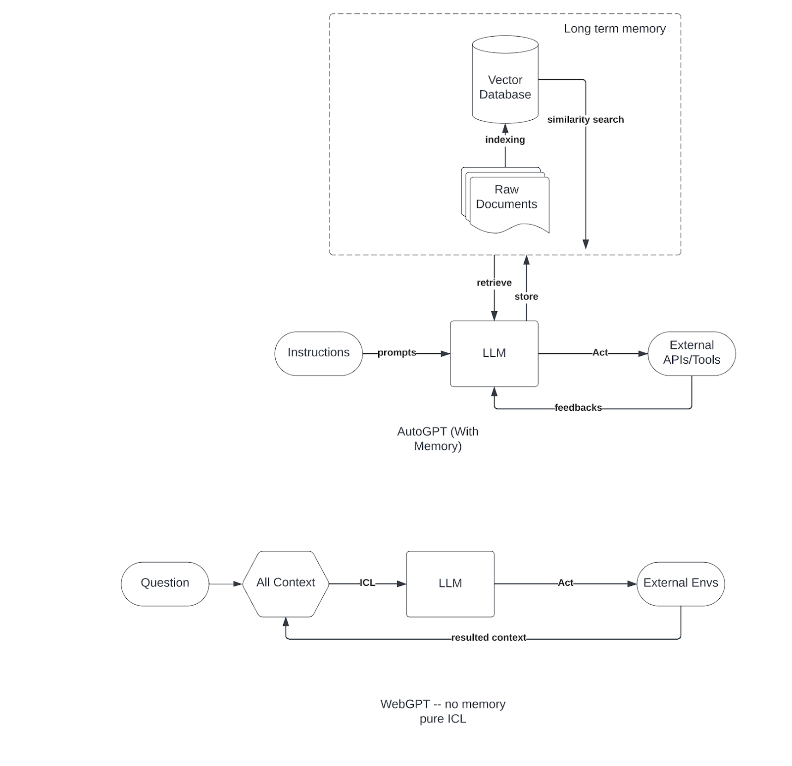 - Managing LLM’s state. This can be done with either pure In-Context-Learning (ICL), which is appending everything action-results to model’s context window (then it follows how to expand LLM’s context window which is another topic); or save/load from external memory services, such as “vector store”. Examples of the former is WebGPT, while the latter is AutoGPT, which stores long-term memories in external services like PineCone.