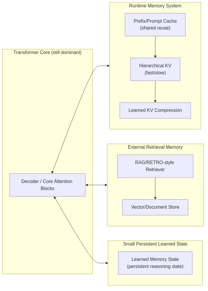 Likely evolution: Transformer + hierarchical KV memory + learned compression + limited/safe parameter updates.